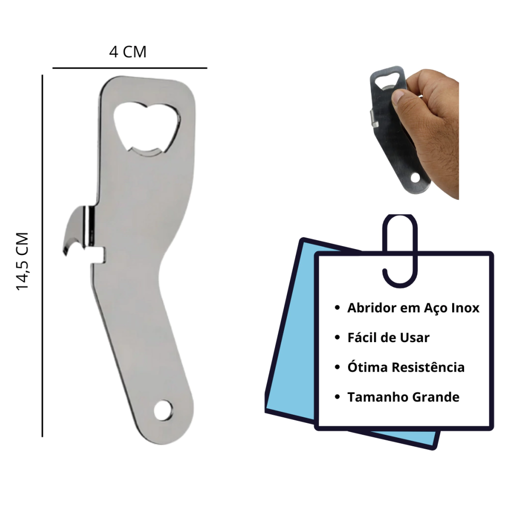 Apresentamos assim o modelo de Abridor Combinado para Latas e Garrafas em aço inox considerando, a funcionalidade, durabilidade, facilidade de uso e armazenamento. Também destacamos para este modelo de abridor especial, com o seu tamanho grande e anatômica facilita a abertura de latas e garrafas com o menor esforço.