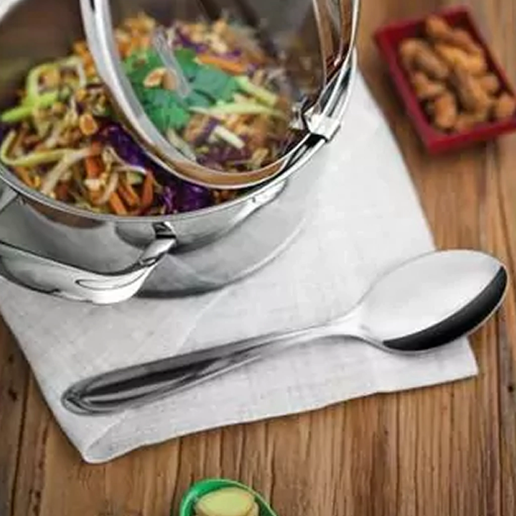 A colher de serviço da linha América é ideal para servir porções maiores de qualquer alimento, sua estrutura e o cabo em aço inox tornam a peça altamente durável e resistente, não correndo risco de oxidar. Com acabamento polido e Colher com bojo em formato simétrico e bordas cuidadosamente arredondadas, proporcionando maior conforto no uso.