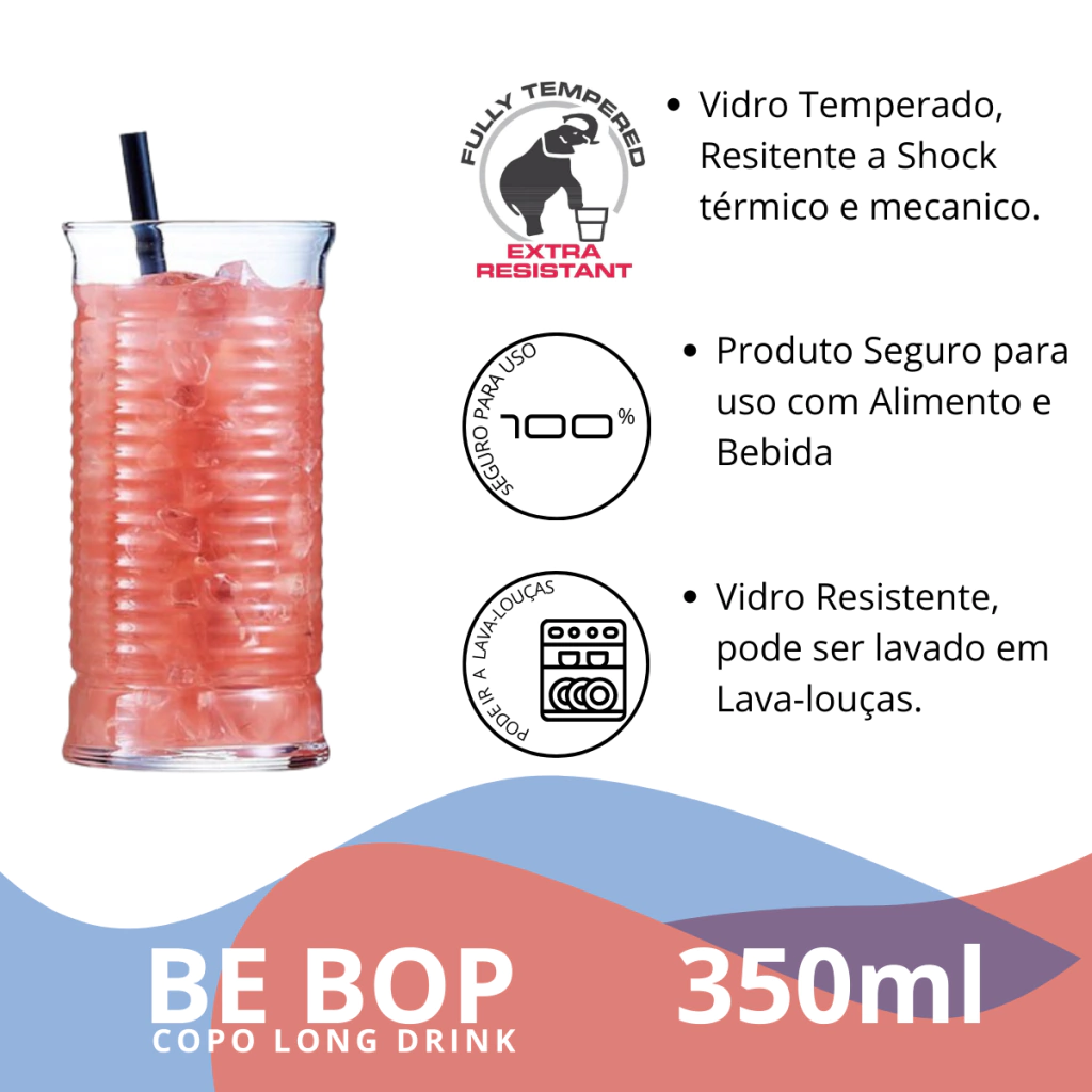 Este Copo de formato único, para long drink com design leve 'Be Bop ou Conserve Moi' da Arcoroc. Destacamos o seu tamanho de 350ml, perfeito para servir long drinks e highballs e até coquetéis Tiki