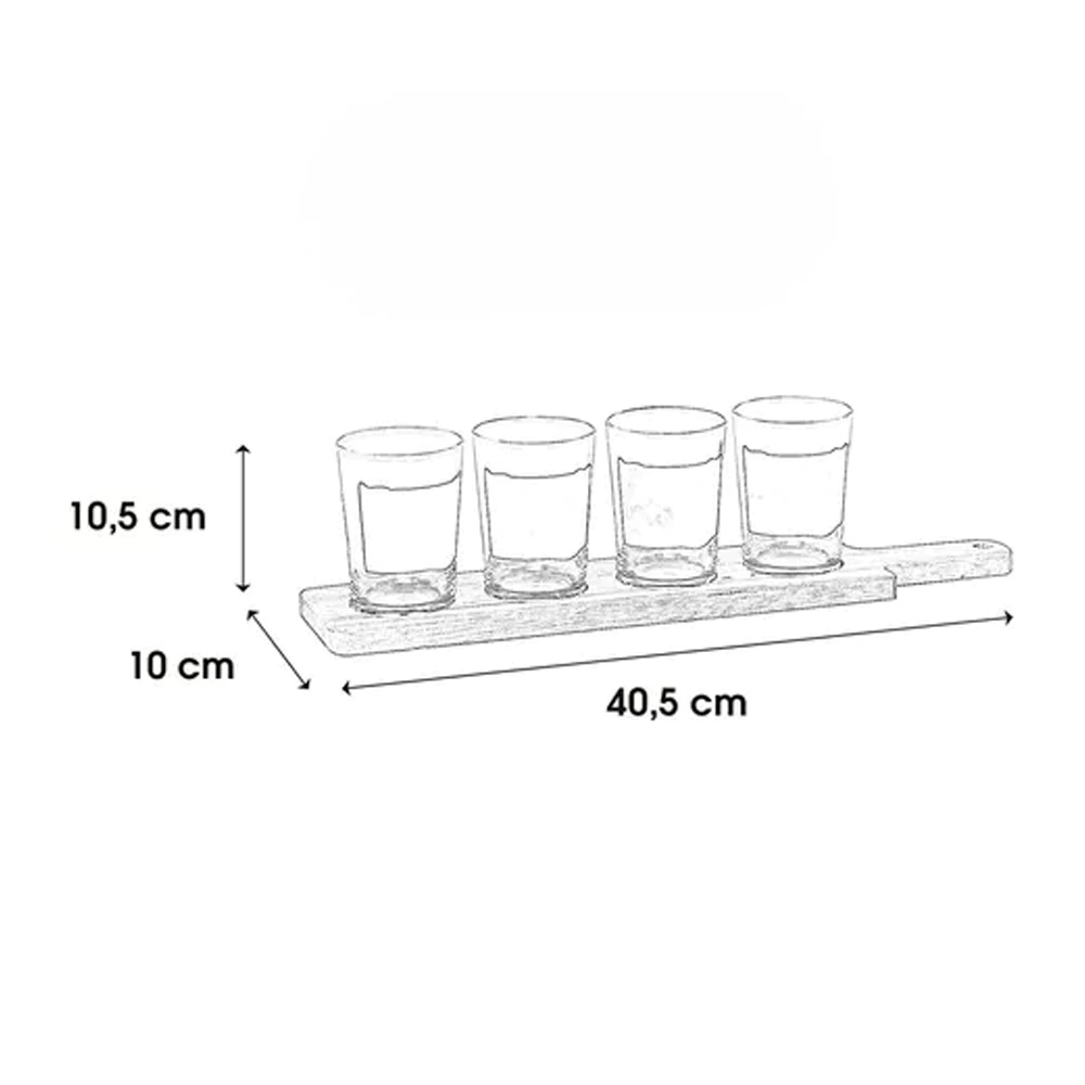 Este kit é completo para degustação de até 4 tipos de cerveja e cada copo possui rotulo para preenchimento do tipo, para fácil diferenciação. Após os copos preenchidos e abastecidos com os sabores preferidos, pode servir com a tábua contida no conjunto.