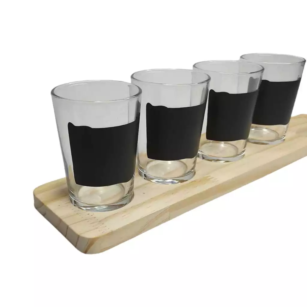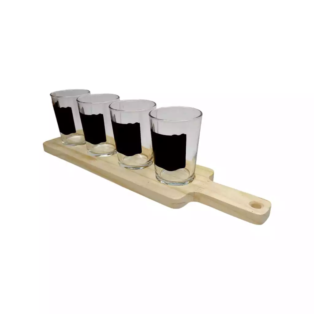 Todos os copos foram colocados com rótulos nos quais os nomes das pessoas podem estar escritos ou os diferentes sabores de cerveja que você está servindo. A tábua de servir de madeira vem com uma alça para fácil transporte e foi rebaixada com cavidades para que os copos se acomodem com maior segurança, na hora de transportar.