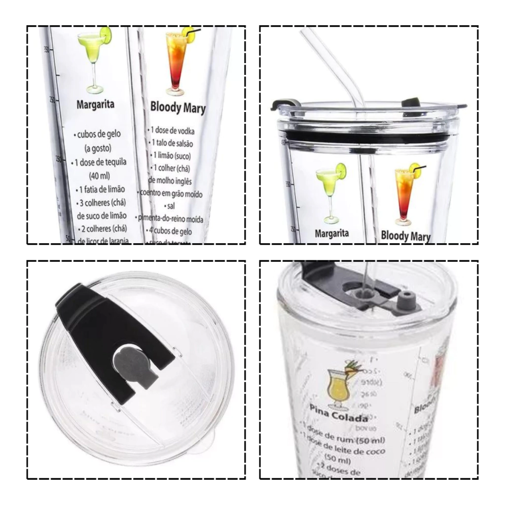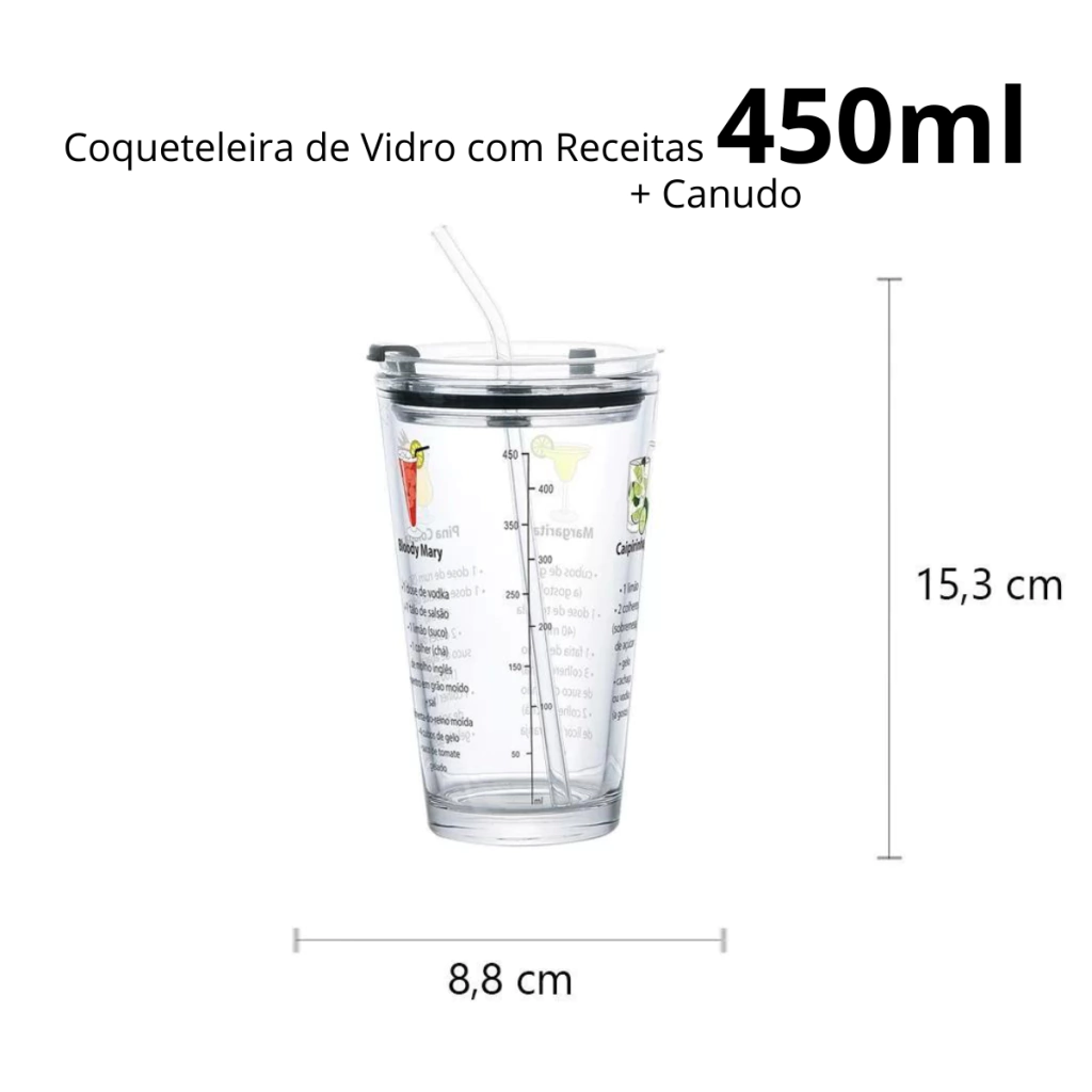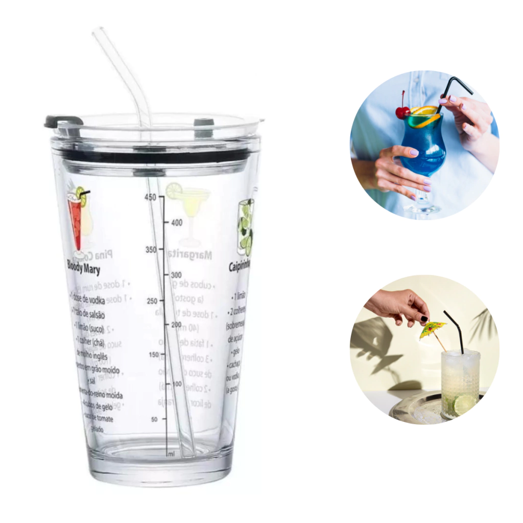 Coqueteleira em Vidro com Tampa e Canudo: