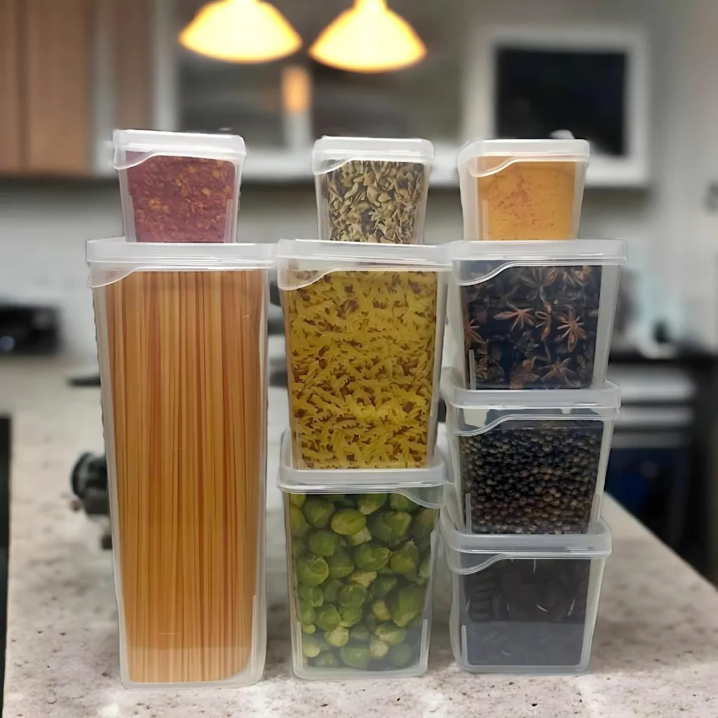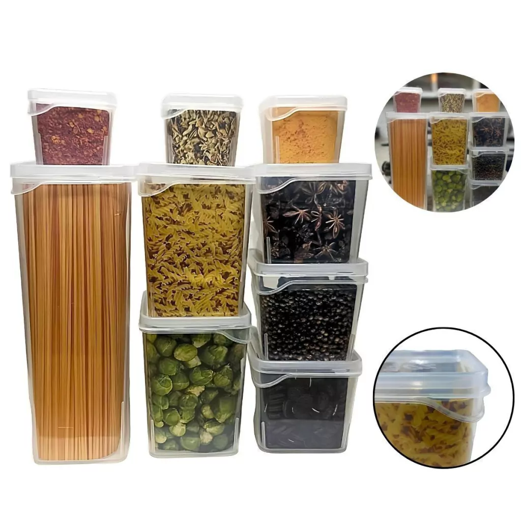 Para ajudar você a armazenar seus alimentos de maneira segura e eficiente, apresentamos nosso kit de potes de cozinha composto por nove peças. Esses potes feitos de plástico premium livre de BPA mantêm seus alimentos frescos enquanto protegem sua saúde.